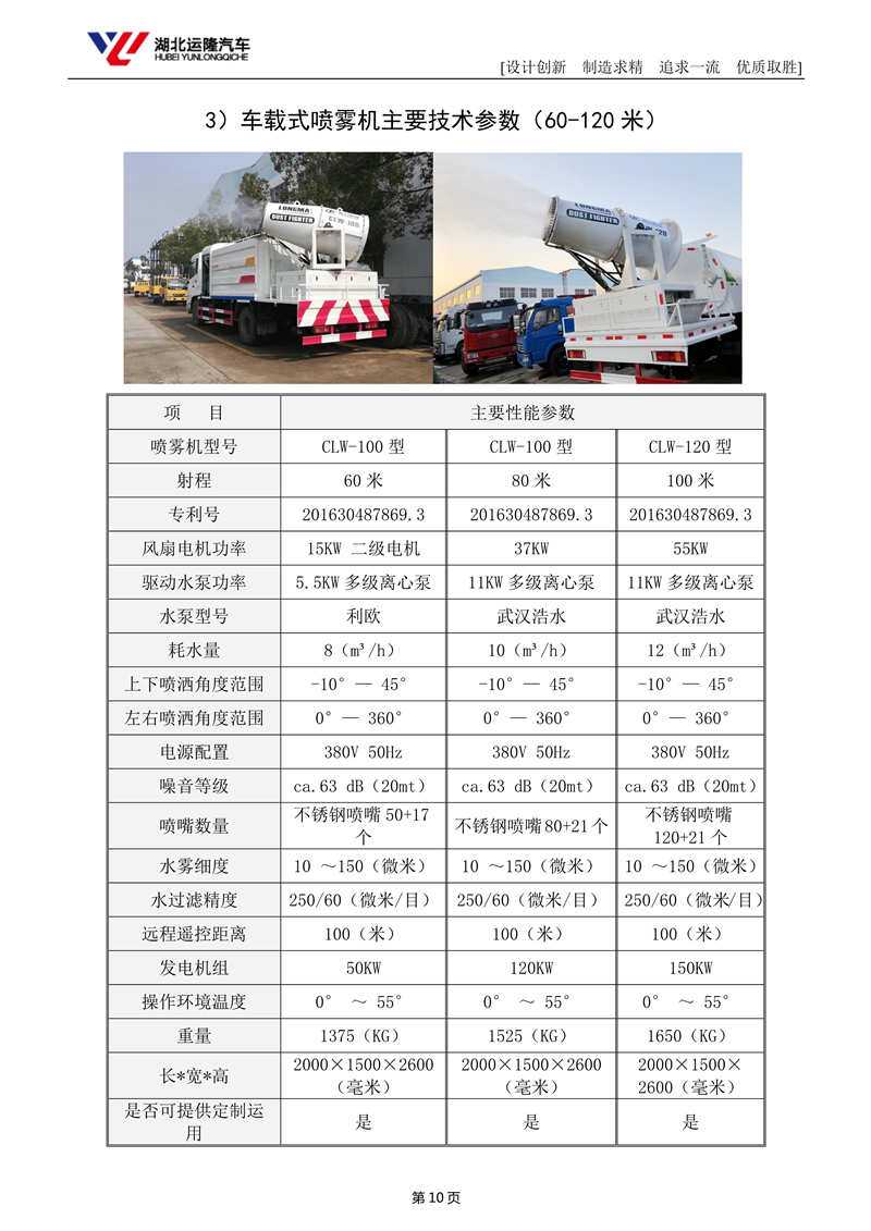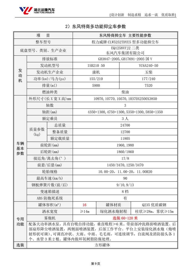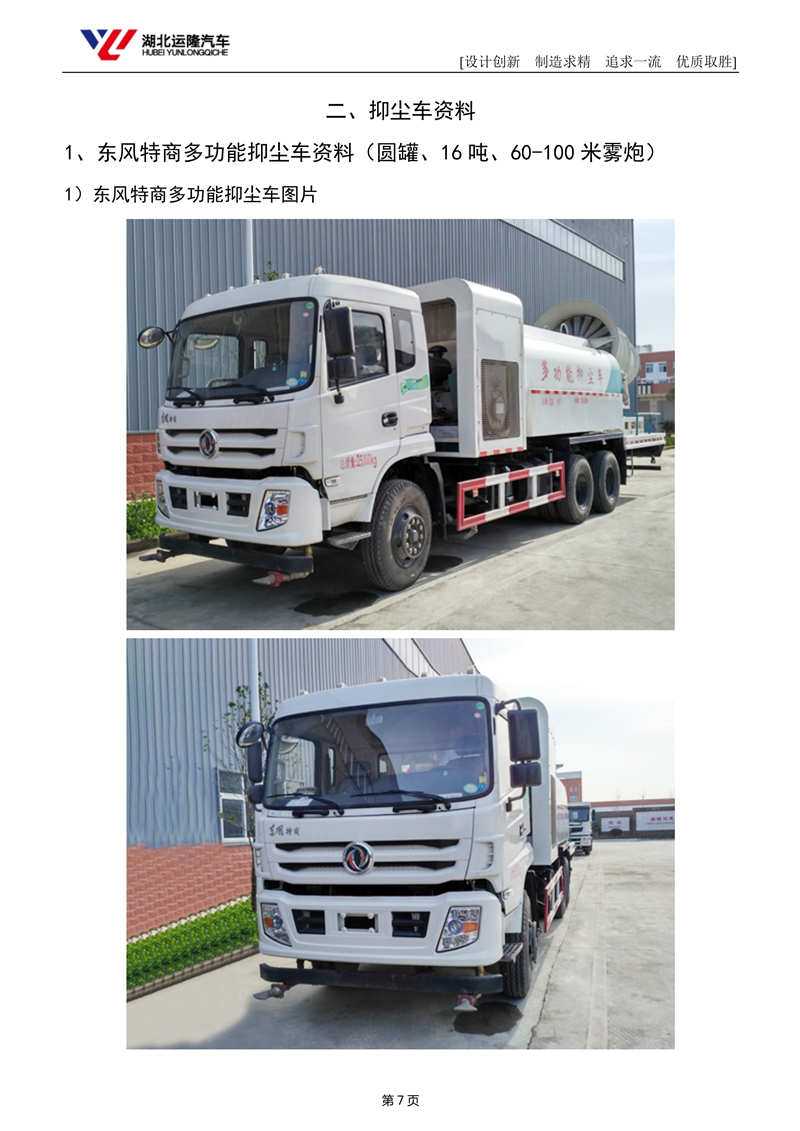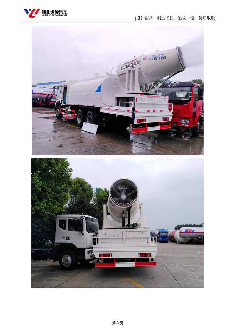 上裝配置:罐體容積為 15-18 立方多功能抑塵灑水車,選配風送式霧炮機組射程50米、60米、80米、100米、120米,罐體鋼板為4mm碳鋼Q235材質,罐內隔板具有防波作用,以減輕汽車行駛時罐體液體沖擊,罐體及整車外形尺寸按照公告。帶大功率專用灑水泵,泵可自吸自排,整車前沖、后灑、側噴、帶65消防接口,后平臺配CLW-50、CLW-60、CLW-80、CLW-100、CLW-120型風送式霧炮機組;罐體前封頭配大功率柴油發電機組;遠程遙控系統控制;霧炮機自動旋轉角度0-360°。后平臺帶綠化灑水炮,灑水炮可全方位旋轉,可連續調成直沖狀、大雨、小雨、毛毛雨;前封頭帶水位計,后平臺主管路帶1寸澆花接口,后爬梯。帶兩根輸水管及陰陽端。罐體顏色:銀/灰/綠,罐體兩側噴“多功能抑塵車”字樣,貼反光標示。