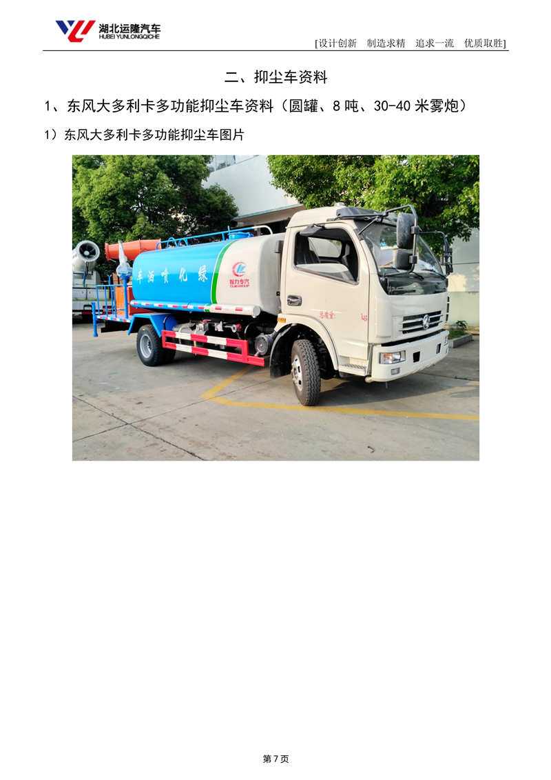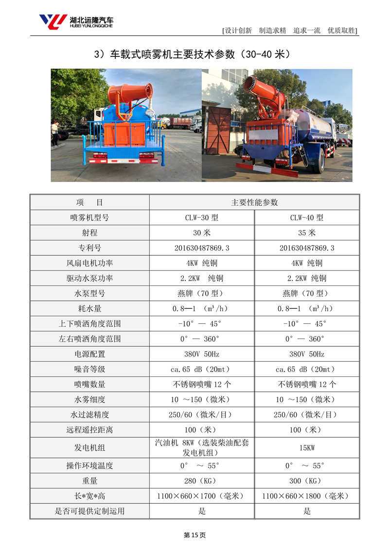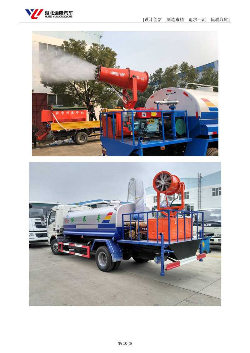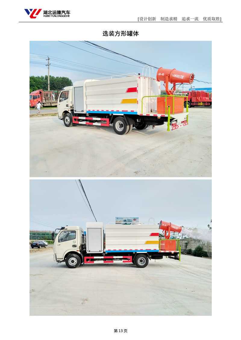 上裝配置:罐體容積為 8立方多功能抑塵灑水車,風送式霧炮機射程30米/40米,罐體鋼板為4mm碳鋼Q235材質,罐內隔板具有防波作用,以減輕汽車行駛時罐體液體沖擊,罐體及整車外形尺寸按照公告。帶大功率專用灑水泵,泵可自吸自排,整車前沖、后灑、側噴、帶65消防接口,后平臺配CLW-30/CLW-40型風送式霧炮機組;汽油/柴油發電機組;遠程遙控系統控制;霧炮自動旋轉角度0-360°。后平臺帶綠化灑水炮,灑水炮可全方位旋轉,可連續調成直沖狀、大雨、小雨、毛毛雨;前封頭帶水位計,后平臺主管路帶1寸澆花接口,后爬梯。平臺后部帶小安全告知牌:“隨時停車,注意安全”,帶兩根水管及陰陽端。罐體顏色:白/蘭/綠,罐體兩側噴“灑水車、綠化噴灑車”字樣,貼反光標示。