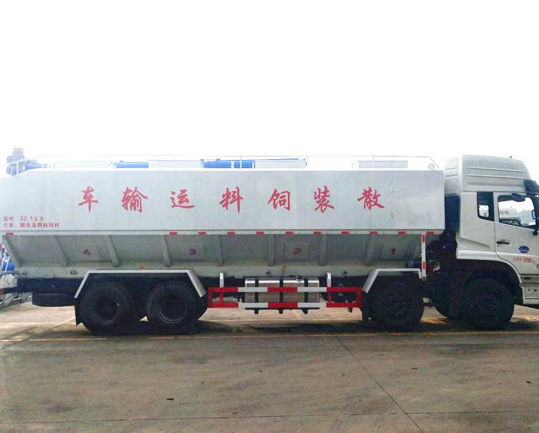 散裝飼料車,又名散裝飼料運輸車,飼料運輸車。結構簡單、性能可靠、輸送量大、操控方便、機動性強、對物料無污染等特點,廣泛應用于各大中小型養殖企業的飼料的運輸。