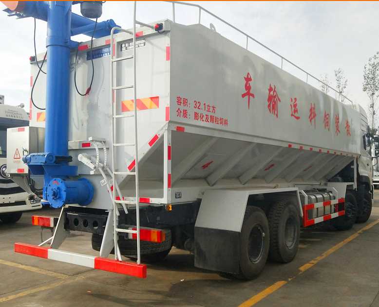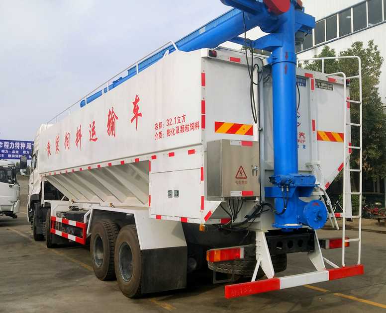 散裝飼料車的飼料罐架設在卡車的底盤上,專用設施由罐體總成、輸送系統(水平卸料系統、垂直卸料系統以及活動卸料系統組成)、散裝飼料車罐液壓系統(高壓油泵經管路與分配閥連接該閥的三個輸出端分別是轉角液壓馬達、升降油缸以及串聯在一起的水平卸料、垂直卸料、活動卸料液壓馬達)、散裝飼料車罐電動系統、氣動分倉機構等組成。在罐體底部設有閘門,在閘門下面裝有水平螺旋輸送器(俗稱水平攪籠),由取力器由汽車變速箱輸出動力驅動,再傳動高壓油泵以驅動液壓系統,散裝飼料車罐液壓馬達通過傳動裝置帶動水平螺旋輸送器的葉片軸及葉片旋轉,經活動輸送系統(俗稱活動攪籠)以將飼料輸出。車頂平置的一根活動卸料絞龍可自由回轉和抬升,運輸時頂部的螺旋管平臥在罐頂;卸料時則抬起,散裝飼料車罐使管端的出料口與畜禽飼養場貯料罐頂部的進料門相接、對準,完成卸料。